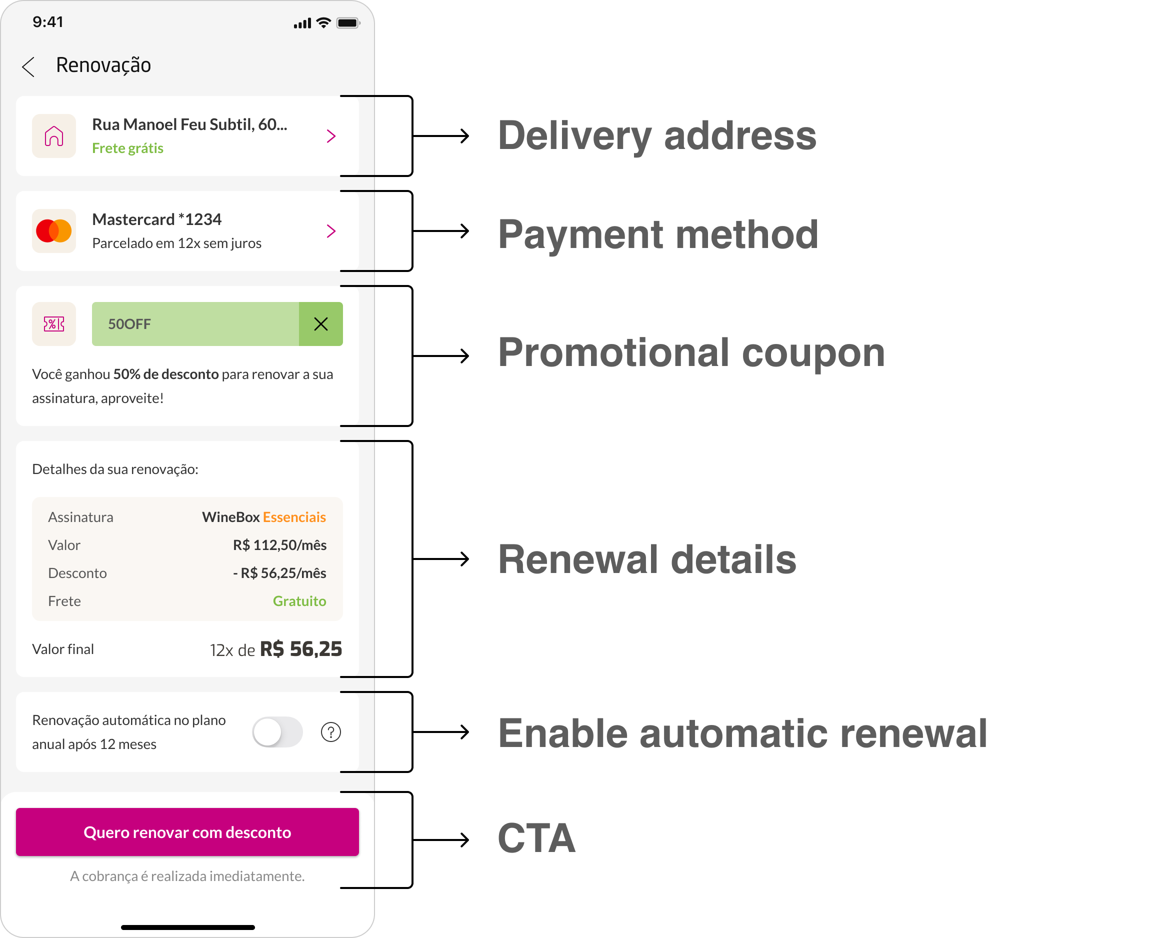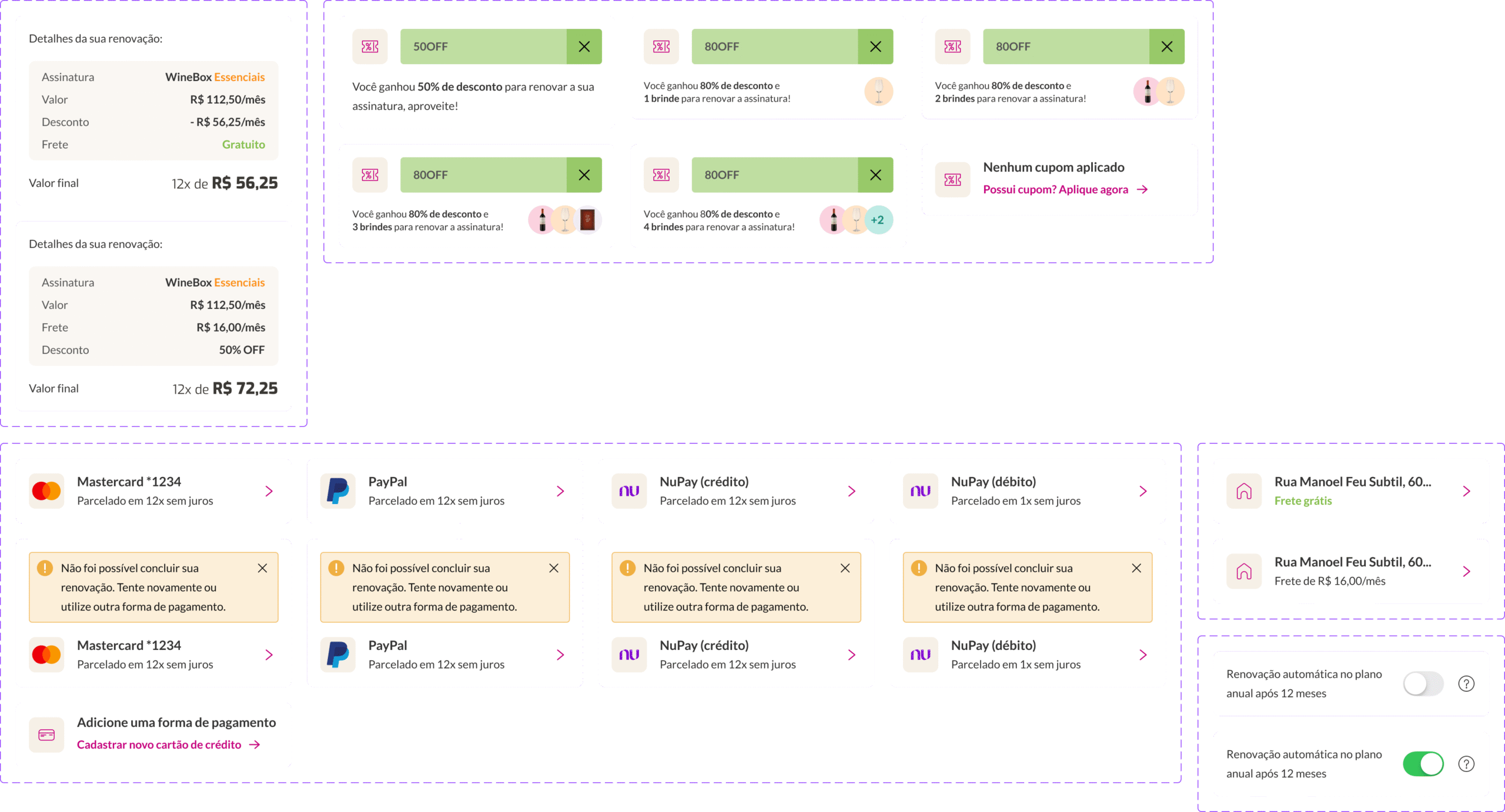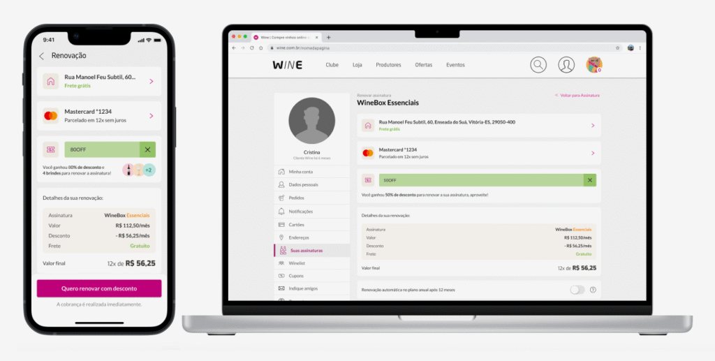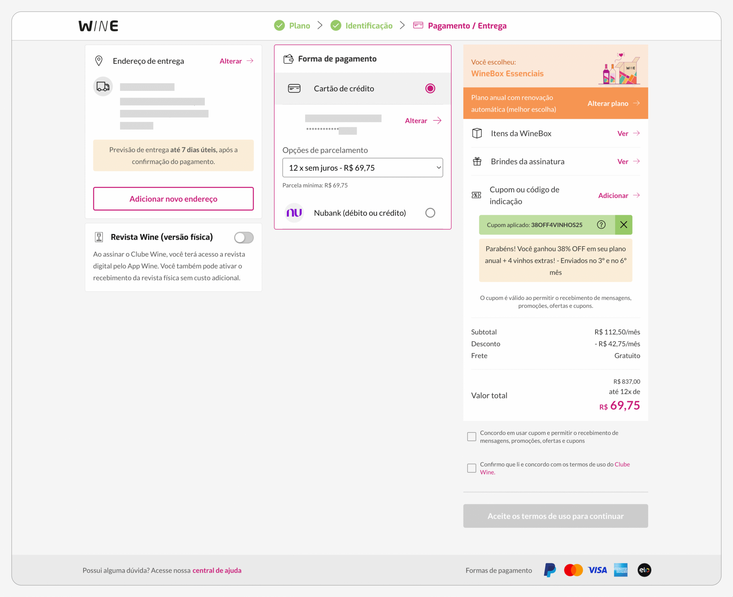 - Clube Wine subscription checkout: Allows customers to start a new subscription. It includes delivery address, payment method, subscription type (plan and modality), WineBox items (monthly wine delivery), and payment details.